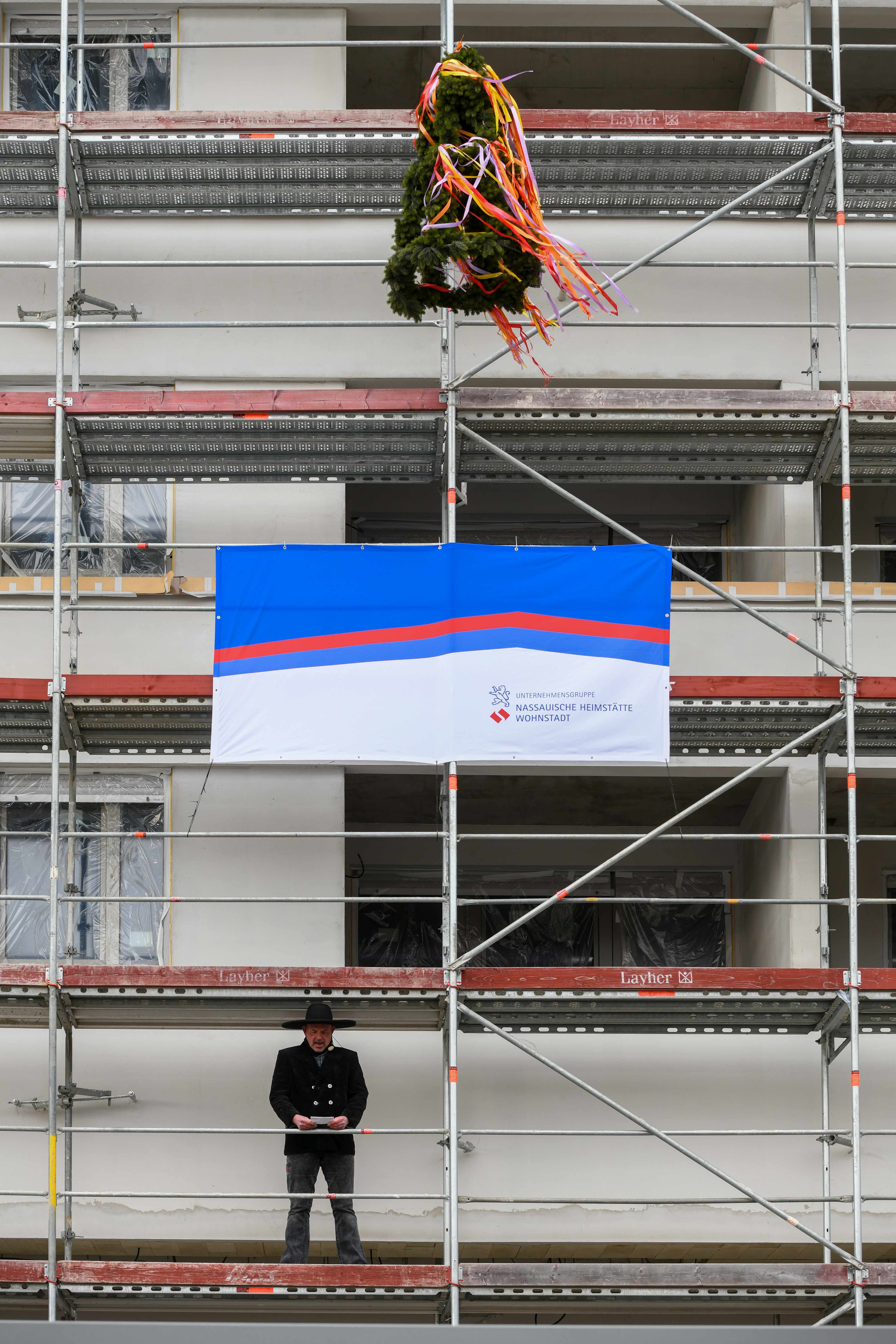 Die Unternehmensgruppe Nassauische Heimstätte | Wohnstadt baut in der Darmstädter Lincoln-Siedlung 248 Wohneinheiten, 105 davon gefördert. Außerdem entstehen ein großflächiger Supermarkt und vier weitere kleine Ladengeschäfte sowie eine Tiefgarage mit 214 Stellplätzen und 600 Fahrradstellplätze. / Richtfest mit Staatsminister Tarek Al-Wazir und Oberbürgermeister Jochen Partsch