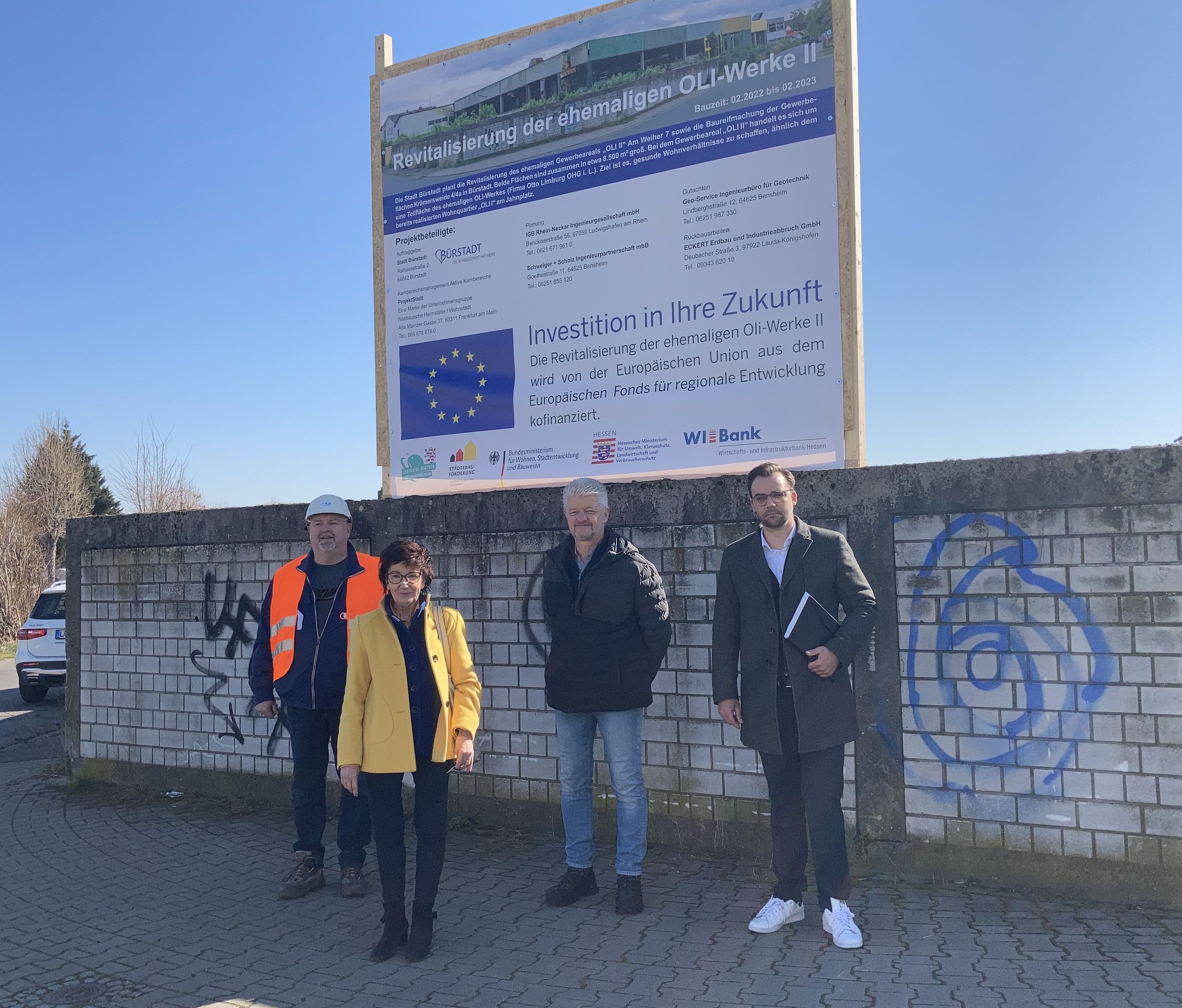 Bürstadt – Die Stadt Bürstadt ist auf dem Weg zu einer neuen Nutzung für die Industriebrache OLI-Werk II sowie angrenzende Gebäude an der Krämersweide einen großen Schritt weiter. Bürgermeisterin Barbara Schader hat zusammen mit Vertretern der ProjektStadt aus Frankfurt am Main und den Vertretern des Ingenieurbüro IGB-Rhein-Neckar das Bauschild präsentiert und offiziell den Start der Abbrucharbeiten verkündet. „Damit haben wir einen wichtigen Meilenstein erreicht“, sagte Bürgermeister Barbara Schader beim Ortstermin am Mittwoch. „Nun können die Rückbauarbeiten beginnen und wir mit unseren Partnern weiter daran arbeiten, das Areal zu revitalisieren und ein attraktives Wohnquartier mit einem hohen Anteil an bezahlbarem Wohnraum zu schaffen.“ Unterstützt wird das Projekt aus EU-Mitteln (Europäischer Fonds für regionale Entwicklung), aus Mitteln der Städtebauförderung (Programm Lebendige Zentren, früher Aktive Kernbereiche) und Landesmitteln (Hessisches Umweltministerium).