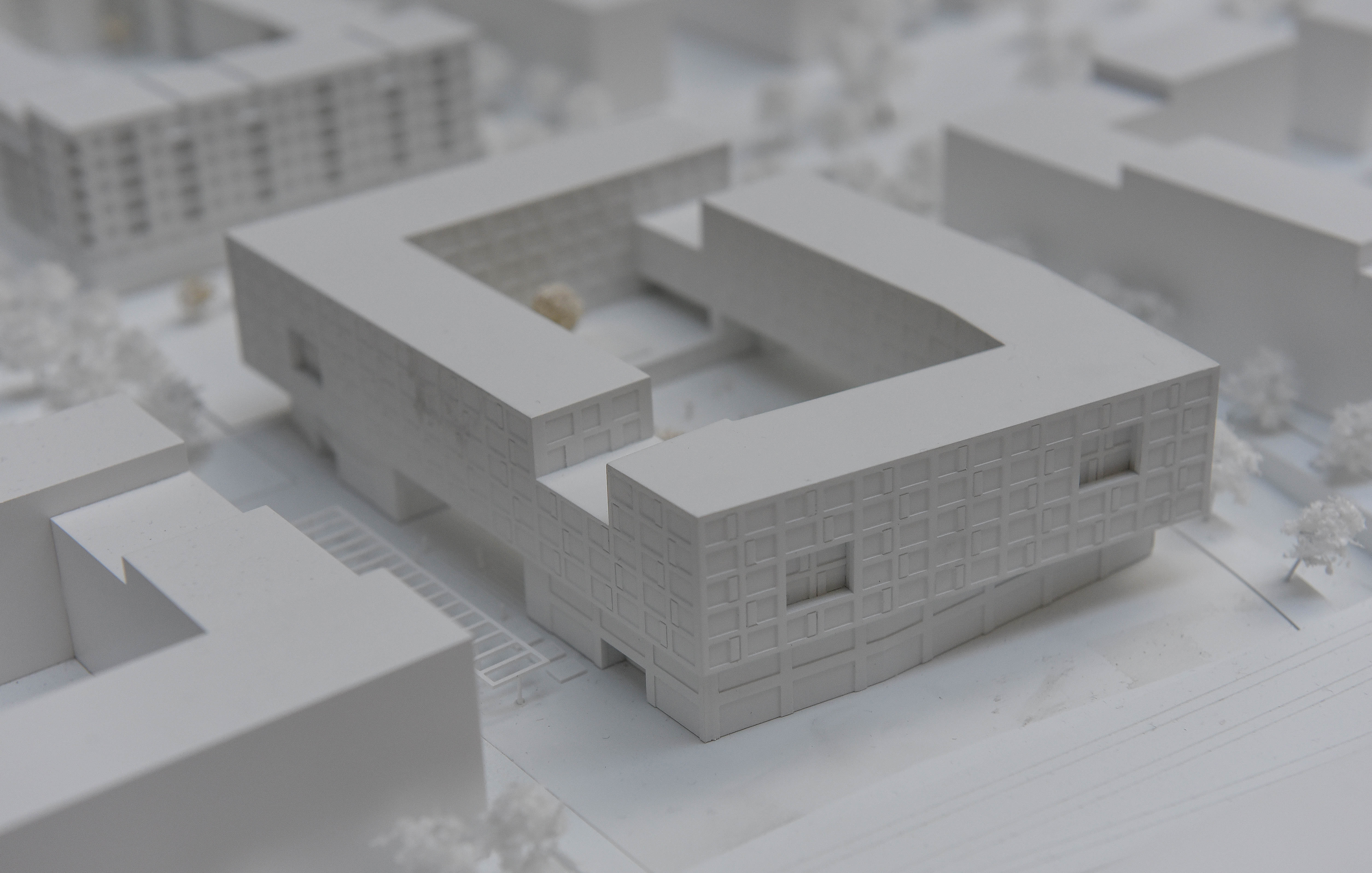 Instone wird in dem nördlich des zentralen Platzes gelegenen Gebäude die Nahversorgung des neuen Quartiers realisieren: zwei Supermärkte, mehrere Einzelhandelsgeschäfte und eine zum Quartiersplatz hin ausgerichtete Gastronomie. Im ersten Obergeschoss liegen Arztpraxen oder Büros sowie eine Kindertagesstätte im Innenbereich. Die restlichen Flächen und alle übrigen Obergeschosse bleiben dem Wohnen vorbehalten. Diese Nutzungsmischung soll dazu beitragen, den Verkehr im Stadtteil weitgehend auf Fahrrad und Fußgänger zu reduzieren. Menges Scheffler Architekten / sander.hofrichter Planungsgesellschaft mbH orientieren sich in ihrem Siegerentwurf an der Blockrandbebauung als Grundgerüst für eine hybride Gebäudenutzung. Mit der gestaffelten Höhenentwicklung reagieren sie dabei auf die angedachte umliegende Bebauung, der Wohnungsbau mit seinen unterschiedlichen Gebäudetiefen profiliert und gliedert die Baukörper zusätzlich. Die gemischte Nutzung wiederum spiegelt sich in der heterogenen Gebäudestruktur wider.