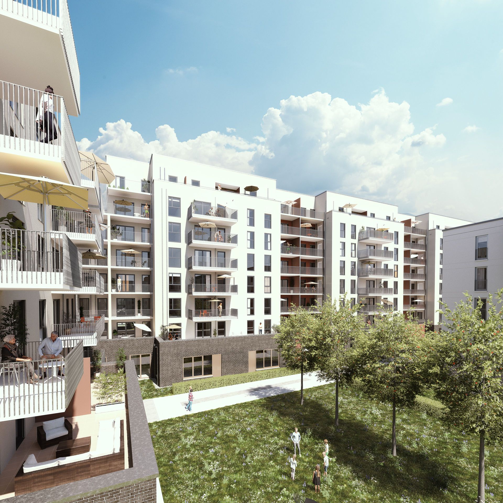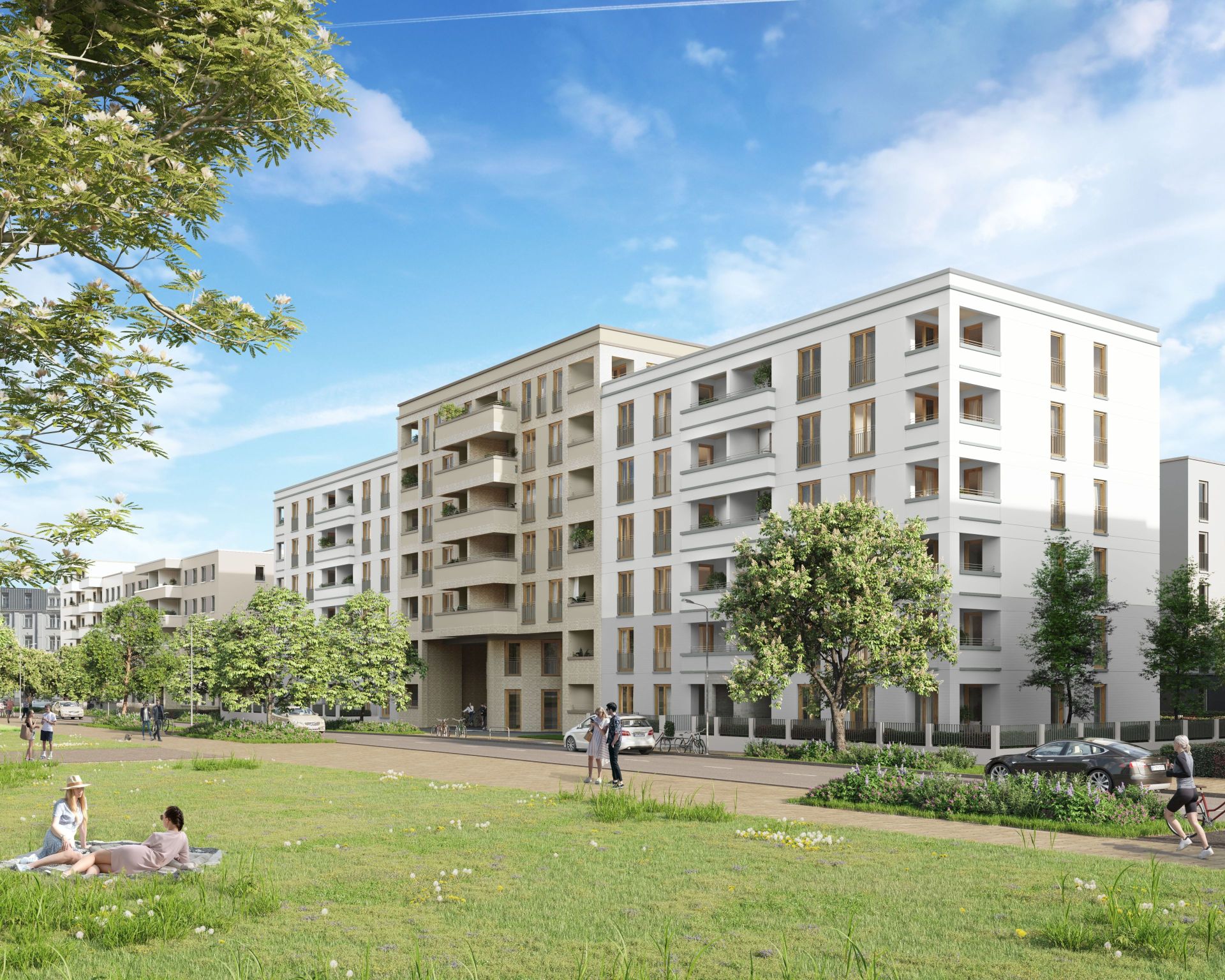 Für den Dezernenten für Planen und Wohnen der Stadt Frankfurt am Main, Marcus Gwechenberger, ist das Projekt ein großer und wichtiger Baustein in der Frankfurter Wohnungspolitik. „Auf den Baufeldern D und E entstehen auf einer Grundstücksfläche von ca. 26.500 m2 über 600 Wohnungen. Angeboten wird ein Mix aus 1,5- bis 6-Zimmer-Wohnungen, der für Singles und Paare ebenso geeignet ist wie für Familien mit Kindern. Alle Wohnungen verfügen über Balkone, Terrassen oder Loggien.“ Hinzu kommen 1.600 Stellplätze für Fahrräder und rund 370 Tiefgaragen-Stellplätze. Alle Dächer in diesen beiden Baufeldern werden mit Photovoltaikanlagen bedeckt. Der Strom, den sie erzeugen, wird zum Teil ins öffentliche Netz eingespeist und zum Teil als günstiger Mieterstrom zur Verfügung gestellt.