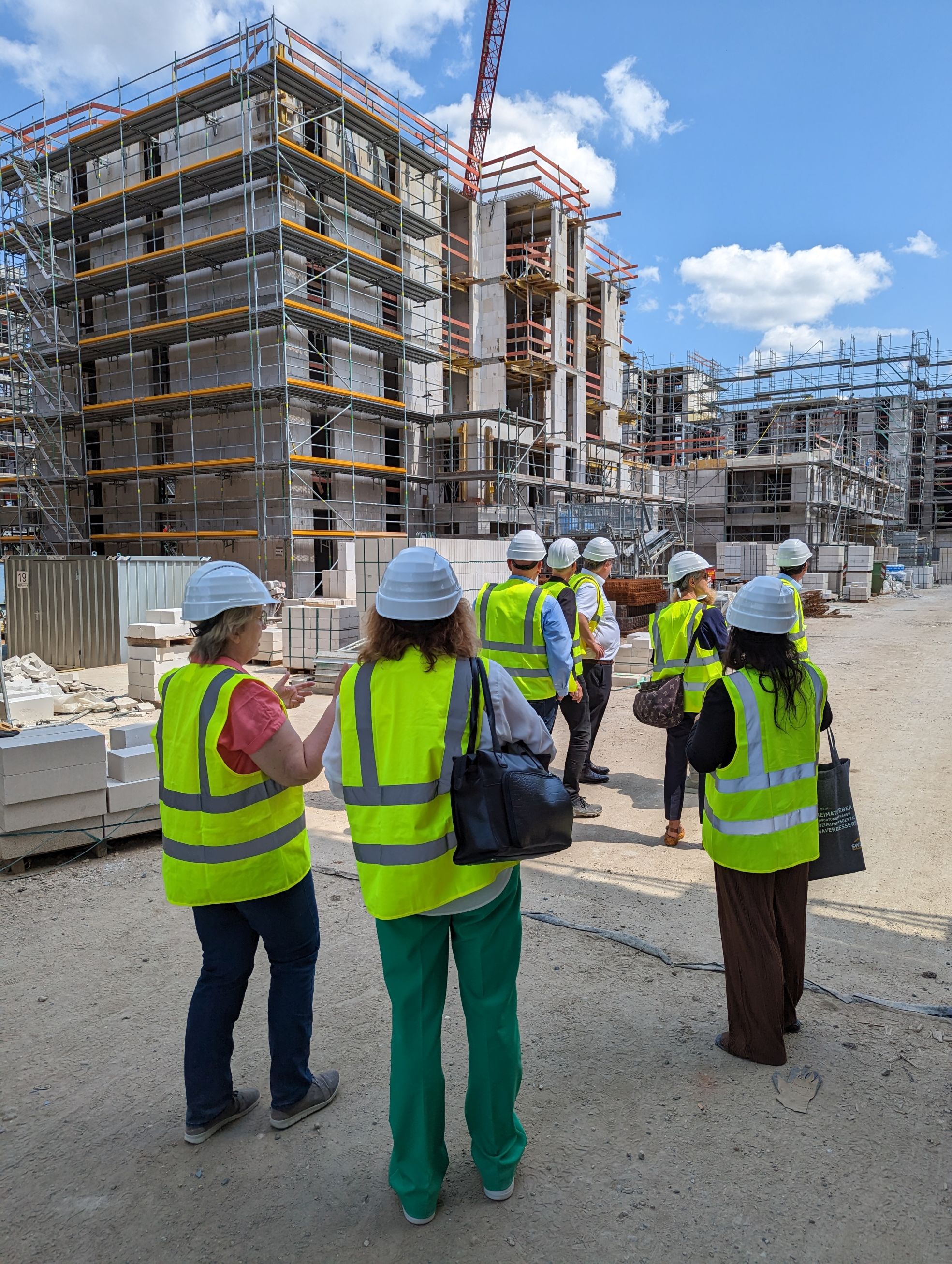 Geschäftsführerin Monika Fontaine-Kretschmer empfing die Gäste am Schaumainkai, dem NHW-Hauptsitz in Frankfurt. Gemeinsam mit NHW-Projektleiter Peter Söhngen besichtigte man dann das gerade entstehende Schönhof-Viertel, Hessens derzeit größtes Neubauprojekt, wo die NHW zusammen mit Instone Real Estate mehr als 2.000 Wohnungen realisiert. Anschließend tauschte sich die Delegation aus Baden-Württemberg im Stadtplanungsamt mit Dr. Markus Gwechenberger, Dezernent der Stadt für Planen und Wohnen, zu aktuellen Fragen der Wohnraumsituation in Ballungsräumen aus. Letzte Station war die Fritz-Kissel-Siedlung in Frankfurt-Sachsenhausen. Hier hat die NHW 14 Wohngebäude mit 82 Wohneinheiten in modularer Holzbauweise aufgestockt. Fachbereichsleiter Alireza Afshar, Projektleiter Sven Schubert und Architektin Iris Elsenheimer von Menges-Scheffler-Architekten erläuterten das Projekt und beschrieben, wie hier zeitgemäße Formen der Partizipation, ökologischer Um- und Ausbau sowie ein qualitätvolles Umfeld von Anfang an ineinandergriffen.