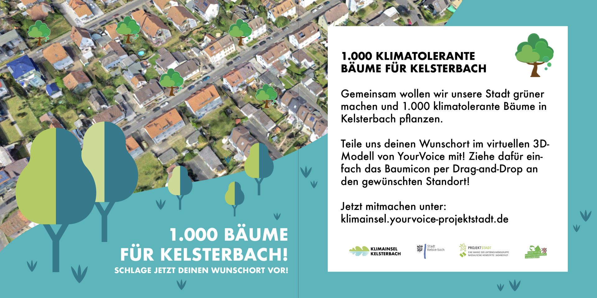 Im Rahmen des Projekts „1.000 klimatolerante Bäume“ lädt die Stadt Kelsterbach ihre AnwohnerInnen dazu ein, aktiv an der Planung teilzunehmen und somit einen Beitrag zur grünen Zukunft der Stadt zu leisten. Hierzu können Interessierte das innovative 3D-Stadtteilmodell YourVoice nutzen, um dort ihre Wunschstandorte für die Bäume mitzuteilen. Das 3D-Stadtteilmodell YourVoice bietet den BewohnerInnen die Möglichkeit, ihre Vorschläge für die Pflanzung von Bäumen an bestimmten Standorten in Kelsterbach einzureichen. Das Modell ermöglicht es den BürgerInnen, interaktiv auf einer virtuellen Karte Orte auszuwählen, an denen sie sich Bäume wünschen. Diese Wunschstandorte werden dann von einem Planungsbüro auf ihre Umsetzbarkeit geprüft.