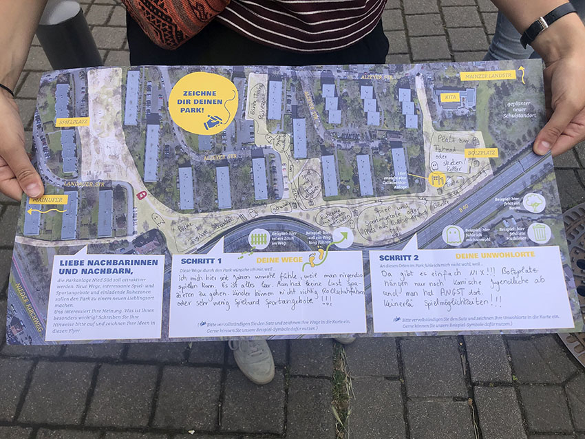 Die Quartiersmanagerin Marja Glage organisierte in diesem Jahr mit den beiden Bewohnervertretern des Beirats Soziale Stadt für Nied-Nord, Sabine Rusko und Thorsten Gleich, mehrere Bewohnertreffen und eine Umfrage zur Neugestaltung der Grünfläche mit Rücklauf von 45 Haushalten. Zuletzt fand an einem Samstagnachmittag ein Gestaltungsworkshop mit über 20 Personen vor Ort statt, an dem die unterschiedlichen Ideen und Wünsche vorgestellt und daraus eine erste gemeinsame Gestaltungsidee entwickelt wurden.