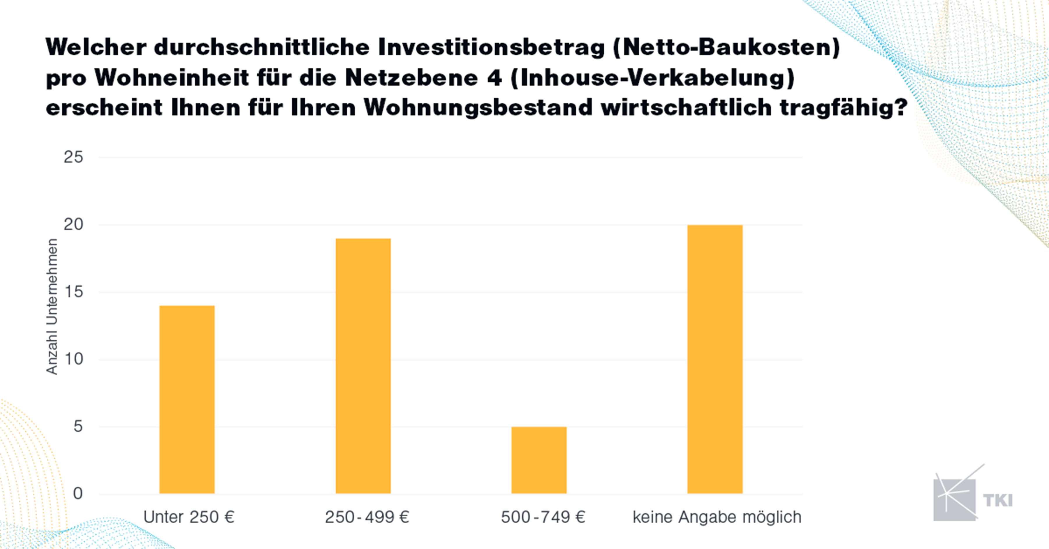 * Wirtschaftlichkeit: Für die Mehrheit der Unternehmen sind nur Investitionsbeträge zwischen 250 € und 499 € Netto-Baukosten pro Wohneinheit (Netzebene 4) wirtschaftlich tragfähig.