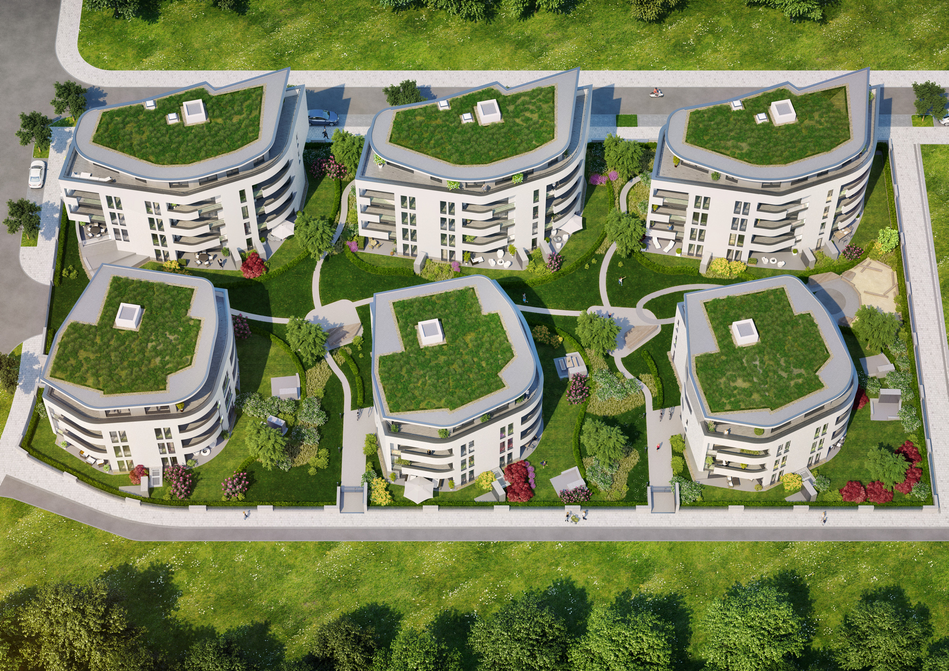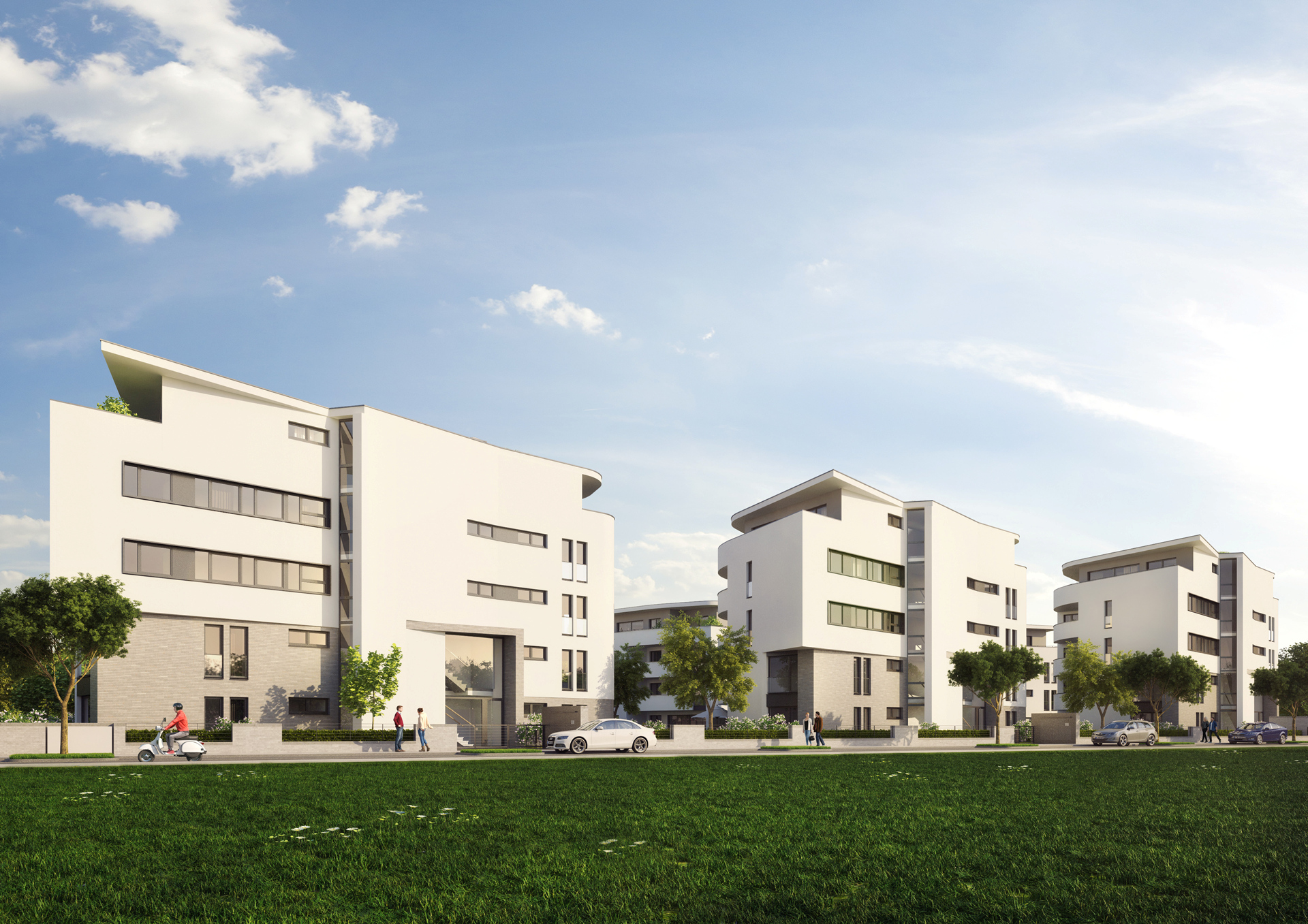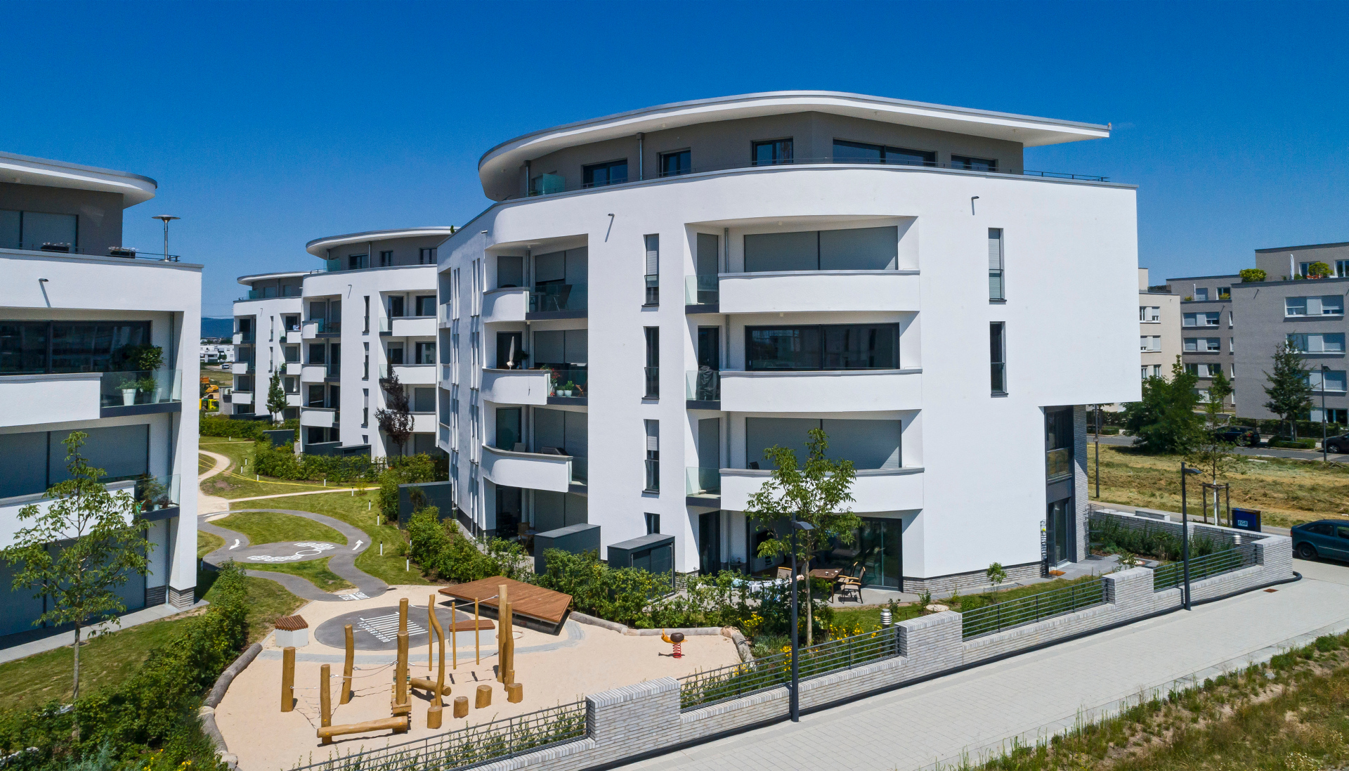 Im Riedberger Westflügel ist eine hochwertige Wohnungseigentumsanlage mit zwei verschiedenen Gebäudetypen entstanden. Die exklusive Eigentumsanlage besteht aus 71 attraktiven Wohnungen in sechs frei stehenden Einzelhäusern mit gemeinsamer Tiefgarage. Die außergewöhnlichen Formen und Linien der Häuser, die interessanten Wohnungsgrundrisse und deren exklusive Ausstattung bieten jedem Bewohner ein individuelles Lebensgefühl.