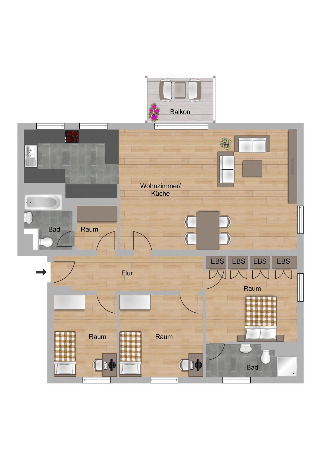Der gut geschnittene und offene Wohnbereich bildet das Herzstück der Wohnung und bietet ausreichend Raum für eine gemütliche Sofalandschaft sowie einen Essbereich. Vom Wohnzimmer aus gelangen Sie auf den Balkon, der zusätzlichen Freiraum im Außenbereich bietet und sich ideal für erholsame Stunden an der frischen Luft eignet. Die weiteren Zimmer lassen sich flexibel als Schlafzimmer, Kinderzimmer oder Arbeitszimmer nutzen und ermöglichen eine individuelle Gestaltung je nach Lebenssituation. Die Küche ist halboffen und bietet Platz für eine funktionale Küchengestaltung nach Ihren Vorstellungen. Ein Badezimmer ist mit einer Badewanne ausgestattet und ein weiteres, an das Elternschlafzimmer angeschlossenes Badezimmer verfügt über eine Dusche.